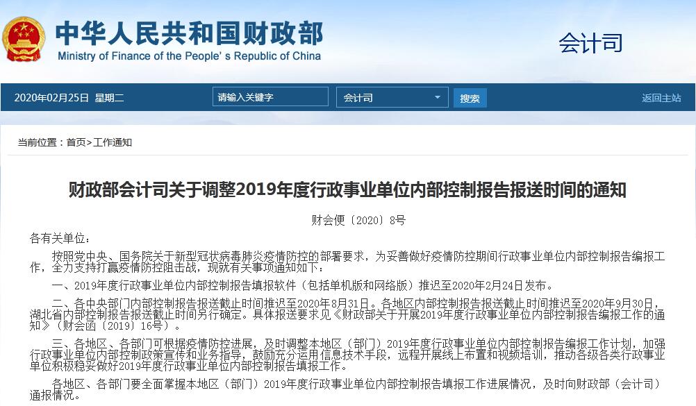 財(cái)政部會(huì)計(jì)司關(guān)于調(diào)整2019年度行政事業(yè)單位內(nèi)部控制報(bào)告報(bào)送...
